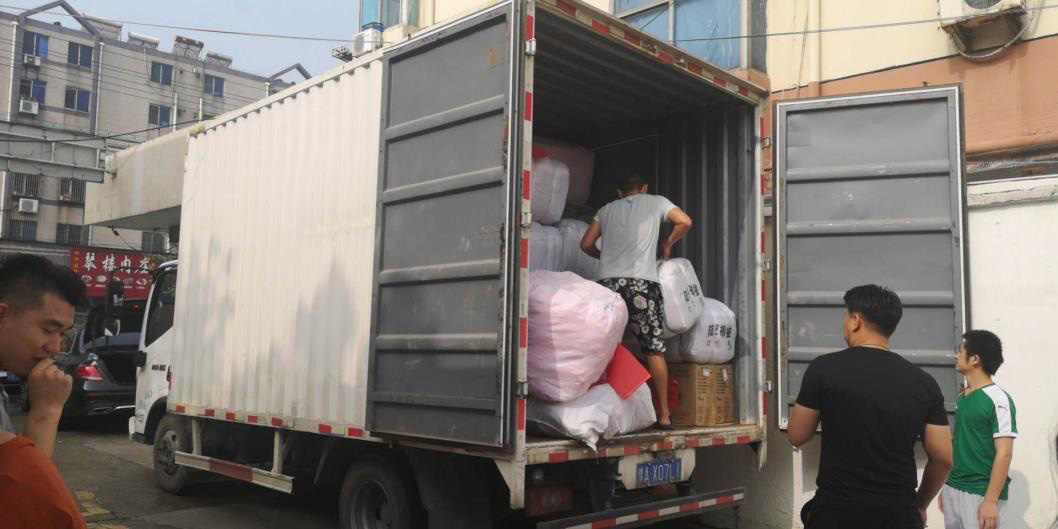 一輛輛掛著“洪災無情,人間有愛”、“洪水無情人有情,一方有難八方支援”條幅的集裝箱貨車駛入了馬鞍山市和縣的民政局救災物資倉庫。